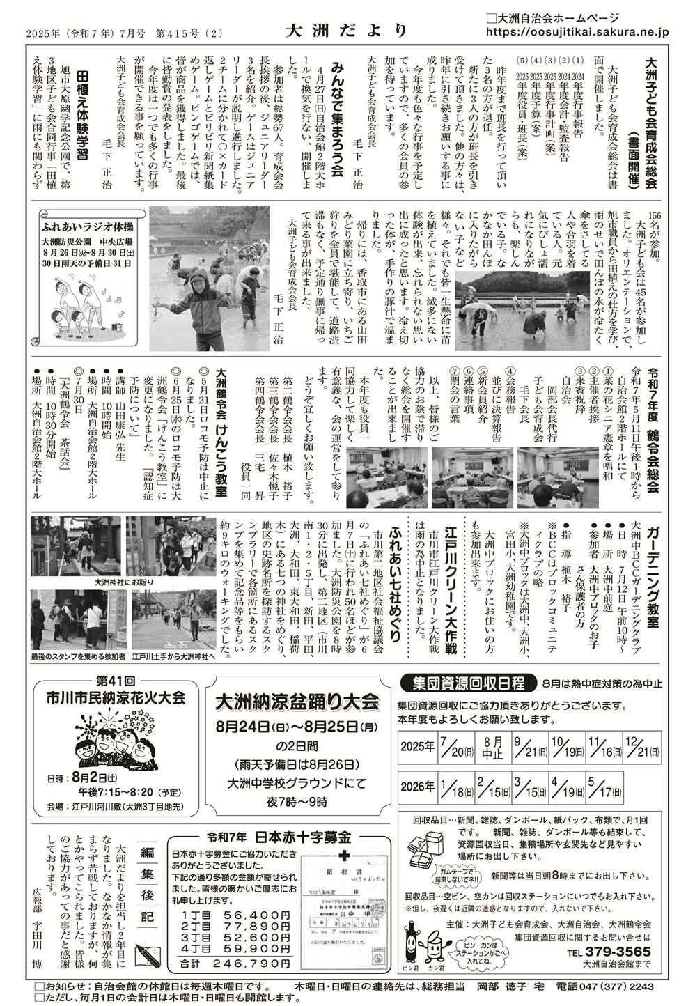 ふれあい七社めぐりの報告、集団資源回収回収日のお知らせ、大洲納涼盆踊り大会のお知らせ、市川市民納涼花火大会