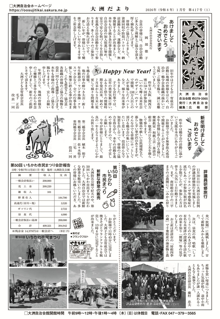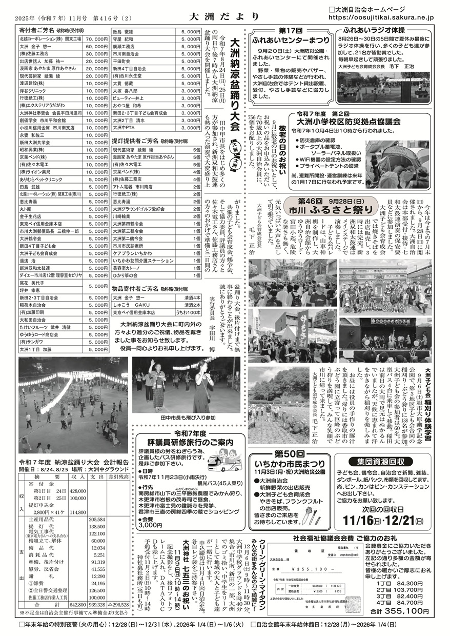ご長寿100歳のお祝い、防犯パトロール実施中、市川ふろさと祭り・子ども山車神輿の報告、大洲鶴令会長寿を祝う会 の報告、大洲子ども会稲刈りぶどう狩り体験学習の報告、大洲大運動会のお知らせ、第49回いちかわ民まつりのお知らせ