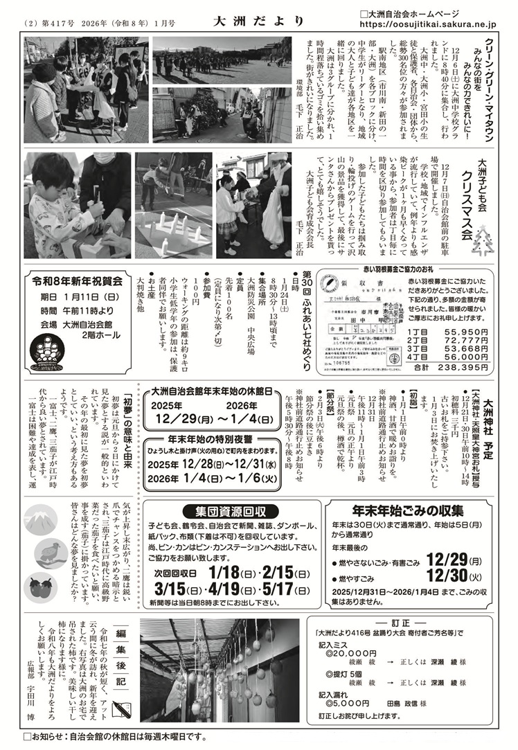 令和7年新年祝賀会の案内、集団資源回収回収日のお知らせ、411号の修正とお詫び、編集後記